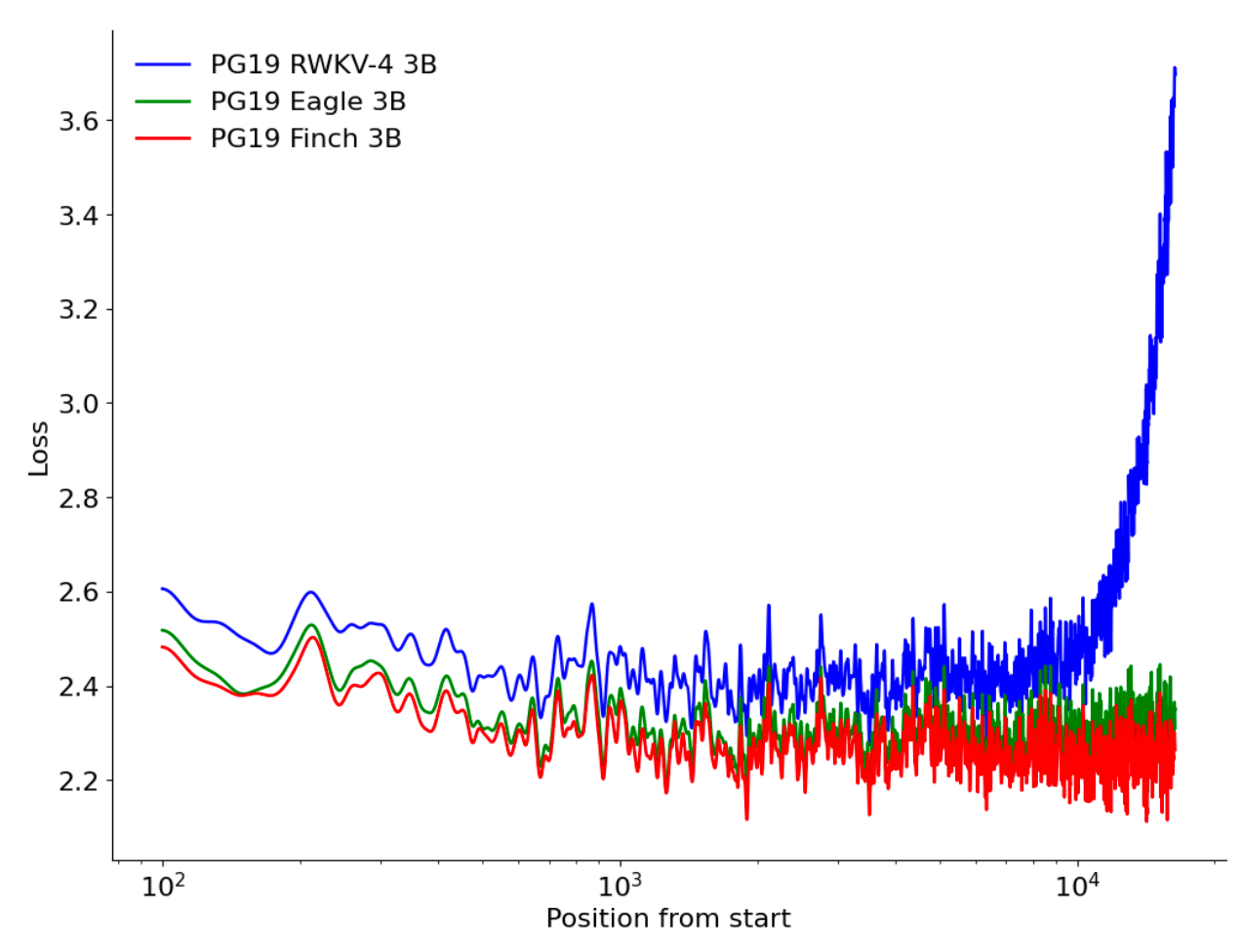 Conquering Long Sequences: The Achilles' heel of traditional RNNs is the vanishing gradient problem. Succinctly, RNNs lose visibility of the first word as they get deep into a sequence of text. The new architectures address this through certain innovations. Eagle/Finch uses a limited time-step window for their recurrence mechanism, enabling handling of unbounded sequence lengths. Hawk/Griffin employ fixed-size hidden states and local attention, avoiding the quadratic memory growth of Transformers.