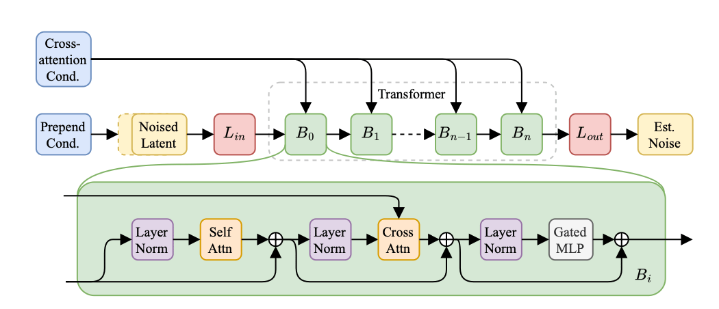 Diffusion-Transformer (DiT): The DiT model operates in the latent space of the autoencoder and generates music by gradually denoising a random noise signal, guided by the text embeddings and timing information.