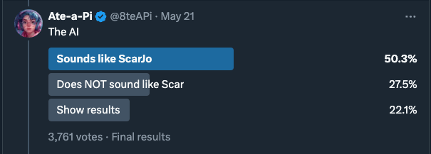 On the one hand> OpenAI created voice> using voice actors who were well informed and fairly compensated including with future royalties> there are 5 voices of which Sky was only one of them> some people do not find the voices similarOn the other hand> the product was modeled on the movie Her> ScarJo was asked to be the voice but turned it down> OpenAI employees mentioned it on Twitter> Reddit and the public have mistaken the voice for ScarJo> there will definitely be emails/Slack showing references to ScarJo during the long product development cycle> US case law is on the side of the celeb over the impersonatorOn the third hand> OpenAI docs show concern over voice output rollout> the voice output likely can imitate any voice with a short input snippet> they have demoāed the same capability for images already: a single input image is enough to generate images with character consistency> voice is likely to be the same as the model is multimodal in and out> a single short input voice is enough to spoof any voiceItās the Napster moment for voice tech.> You can block it off for a year, but very soon any phone will be able to spoof any voice on command.> If you can tell the AI model āuse Morgan Freemanās voice on heliumā and it does and thatās part of the base capability of an open source model released next year, what do you do?> open source models with this tech are š free speech> do you tell the phone manufacture that this software cannot run on the phone ?> do you sue developers who access this capability on the model?> do you sue the individual users?> do you segment human voices? Are there 8 billion unique voices in the world so that there is no collision?> do you award the voice to the person with more money? With a higher number of social media followers?> perhaps there can only be 10,000 voice owners in the world and they all have to be members of SAG-AFTRA, and no device should ever be able to generate any other voice without paying one of the owners.@8teapi