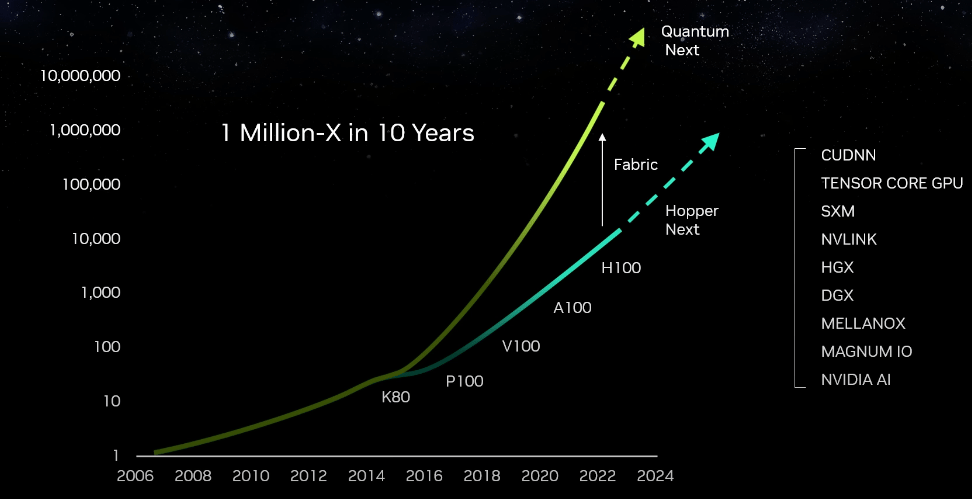 Jensen Huang’s target at Nvidia is a 1 million-fold (or 6 OOM) improvement over the next 10 years to match the progress of the last 10 years. This works out to 0.6 OOM per year, or slightly over Leo’s 0.5. So while this may be an erroneous assumption, it is the market assumption at this point.