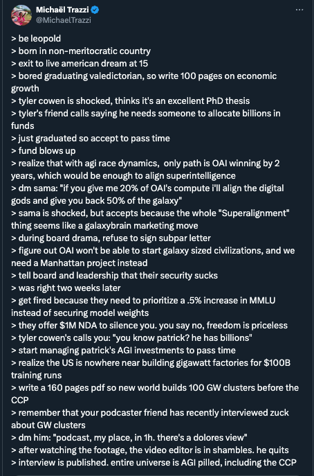 Leopold Aschenbrenner, 2x OpenAI researcher fired in April 2024, was on the Dwarkesh podcast this week. Along with a 4-hour pod, he dropped a 160-page treatise on the coming Intelligence Explosion in the decade ahead, to expound on his Situational Awareness.