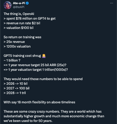 What comes next is fairly significant. To keep the revenue doubling every 6 months pace, the revenue target for next year would be ~$25 billion ARR. That’s $2 billion per month by Dec 2025.