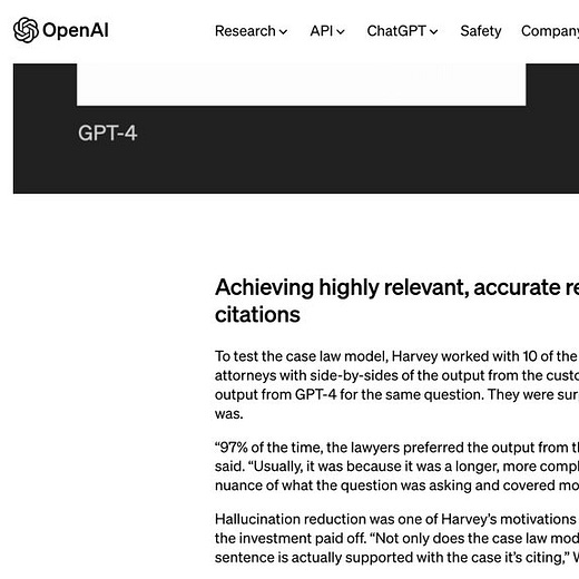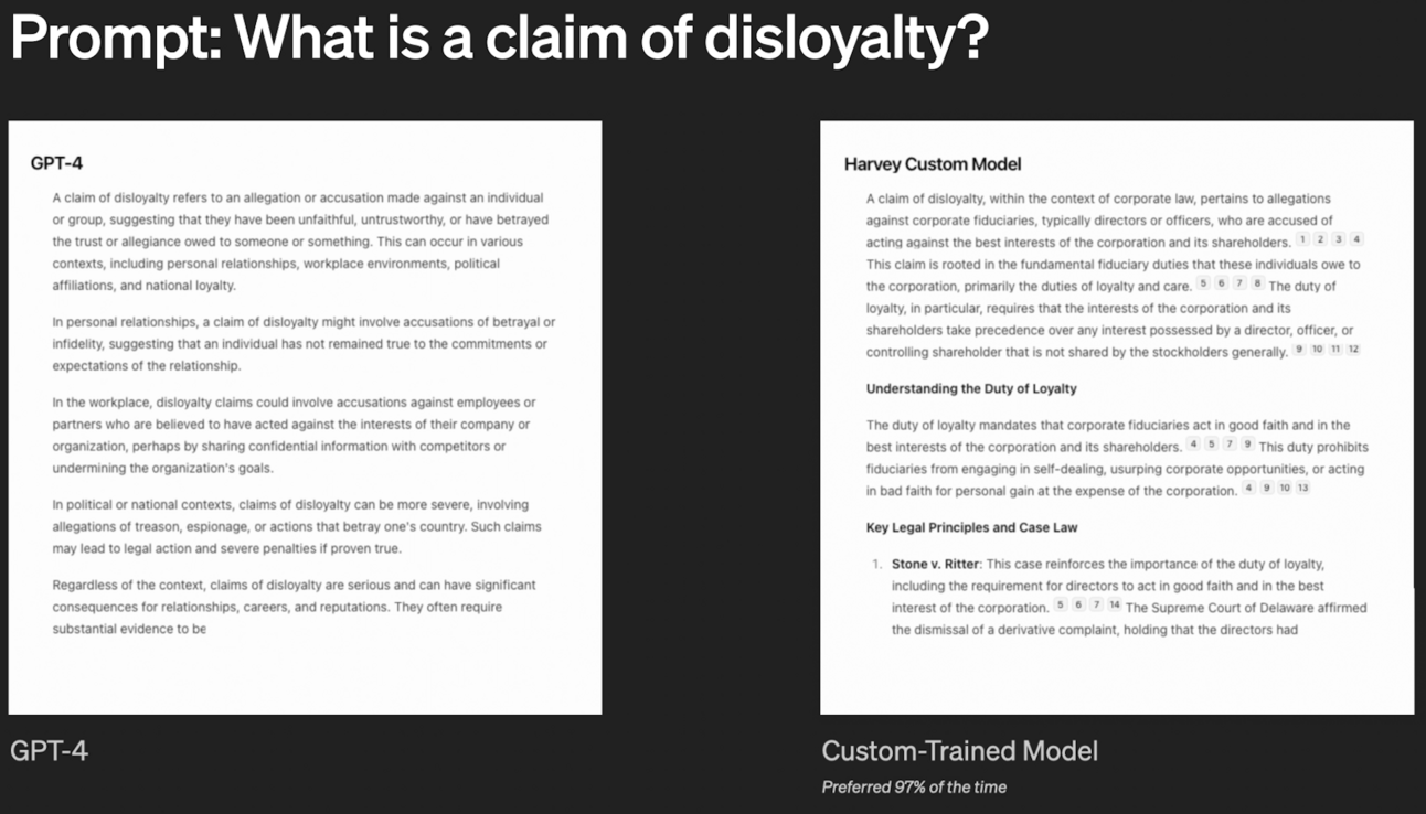 In tests with 10 large law firms, attorneys preferred the output from Harvey's custom case law model 97% of the time compared to GPT-4
