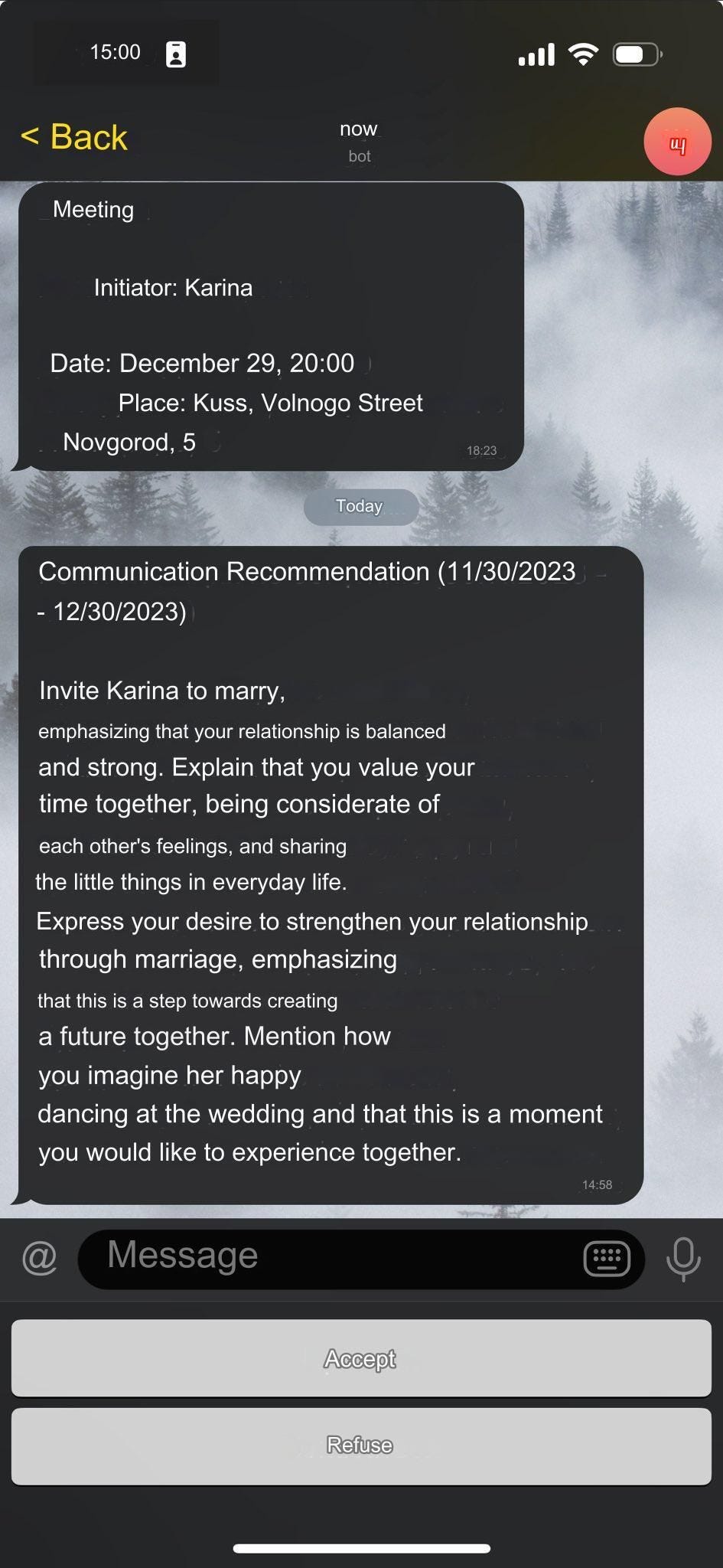 Proposal prompt: “Offer me a plan so that a girl accepts a marriage proposal, taking into account her characteristics, and chat with her.”