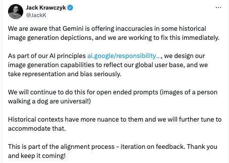 Google Legal: “I don’t want any Nazis, you hear?”Google Product: “But.. but”Google HR: “Are you a Nazi? Why are you so obstinate about this?”Google Engineering: “We’d have to fake the weights, it won’t represent reality”Google Legal: “We must avoid any harm at all costs”Pre-Gemini Launch Meeting (Imagined)