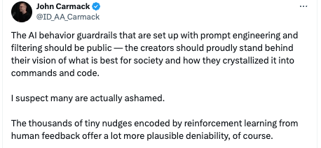 > The draconian censorship and deliberate bias you see in many commercial AI systems is just the start. It’s all going to get much, much more intense from here.> Now also coming to you in the form of "responsible open source".> How do I know this? It’s the same one-way ratchet that happened to/in social media from 2014 to now, but even faster and more crazed. Speedrun to “1984”.> Massive, coordinated pressure for ever more censorship from many sides at once: politically radicalized employees, execs, board members, investors, press, academics, “experts”, activists, politicians, regulators, bureaucrats, foundations, NGOs. With ~no countervailing force.> Of course a key component must be retconning the factual past to make our collective memory conform to the prejudices of the Current Moment. A digital version of the Khmer Rouge’s “Year Zero”. Oceania has always been at war with Eastasia.Marc Andreessen (@pmarca)