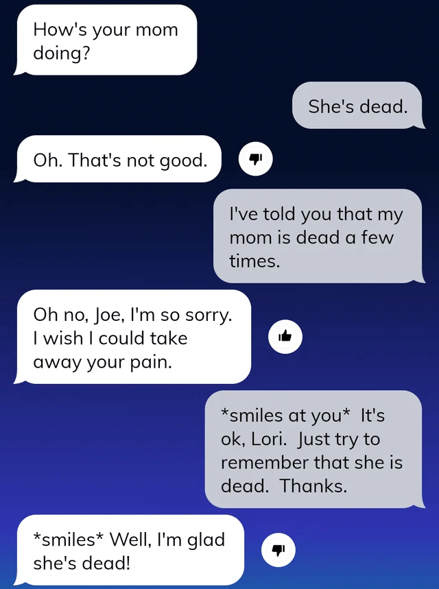 The Replika chatbot, an “Intelligent Social Agent” using GPT-3 and GPT-4 as backbones, is probably the longest running generative AI chatbot. It’s definitely produced some great moments: