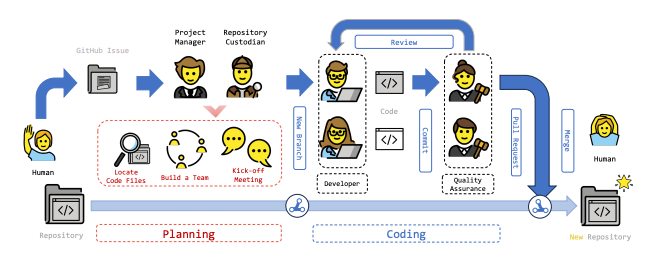 The agents work together to analyze issues, find relevant files, create a plan, implement code changes, and verify the modifications. The inspiration comes from Github Flow, a commonly used workflow paradigm.