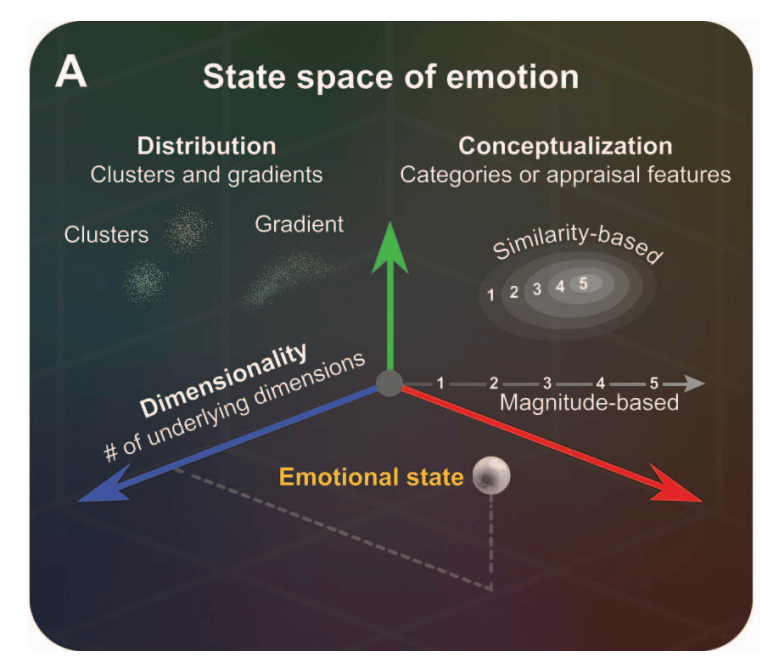 (A) Schematic representation of a semantic space of emotion. A semantic space of emotion is described by (a) its dimensionality, or the number of varieties of emotion within the space; (b) the conceptualization of the emotional states in the space in terms of categories and more general affective features—that is, the concepts which tile the space (upper right); and (c) the distribution of emotional states within the space. A semantic space is the subspace that is captured by concepts (e.g., categories, affective features). For example, a semantic space of expressive signals of the face is a space of facial movements along dimensions that can be conceptualized in terms of emotion categories and affective features, and that involves clusters or gradients of expression along those dimensions.American Psychologist