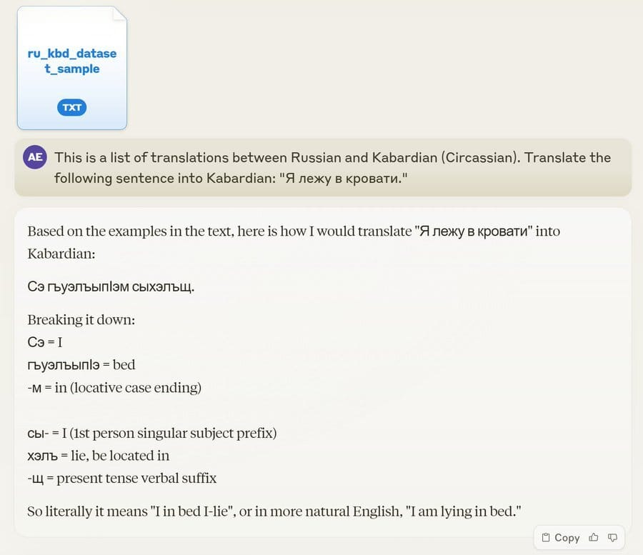 I've been working on NLP for my mother tongue - the Circassian language for the past 2 years. Circassian is very low-resource, with negligible internet presence. It's a part of the Circassian-Abkhaz isolated language group, meaning they have no related languages. Its complex morphology & limited data make it a serious challenge for language models.Over these years I painstakingly curated 64K translation pairs from scarce sources & trained specialized models (T5, MLM-100, NLLB-200 etc.) to achieve decent Russian-Kabardian machine translation.I decided to try an experiment with Claude Opus. I started a new chat and attached just 5.7K randomly selected translation pairs of single words/sentences - a fraction of my 64K dataset, not even covering the full vocabulary. To see if it would be able to translate novel sentences based on these examples.Not expecting much at all, I asked it to translate a simple sentence - "I am lying in the bed" from Russian to Circassian. Claude not only provided a perfect translation but also broke down the grammar & morphology.@hahahahohohe