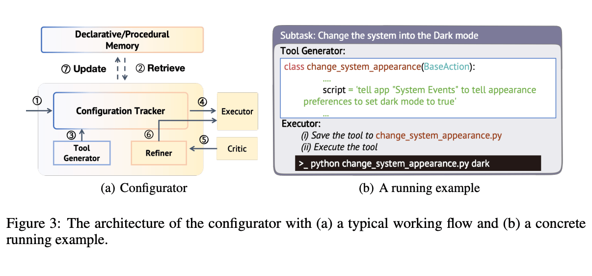 Created a set of sequential prompts and code, grouped into agents such as: Planner - decompose user requests into smaller tasks Configurator - middleware to take each task and configure it with data from memory or how-tos from tool repositor before passing to Executor Declarative memory - user profile and history of previous actions Tool repository - tools available Working memory - where the next steps for tasks and previous history are kept Executor - generates executable command Critic - assessing whether a task has been completed successfully or whether iteration is needed