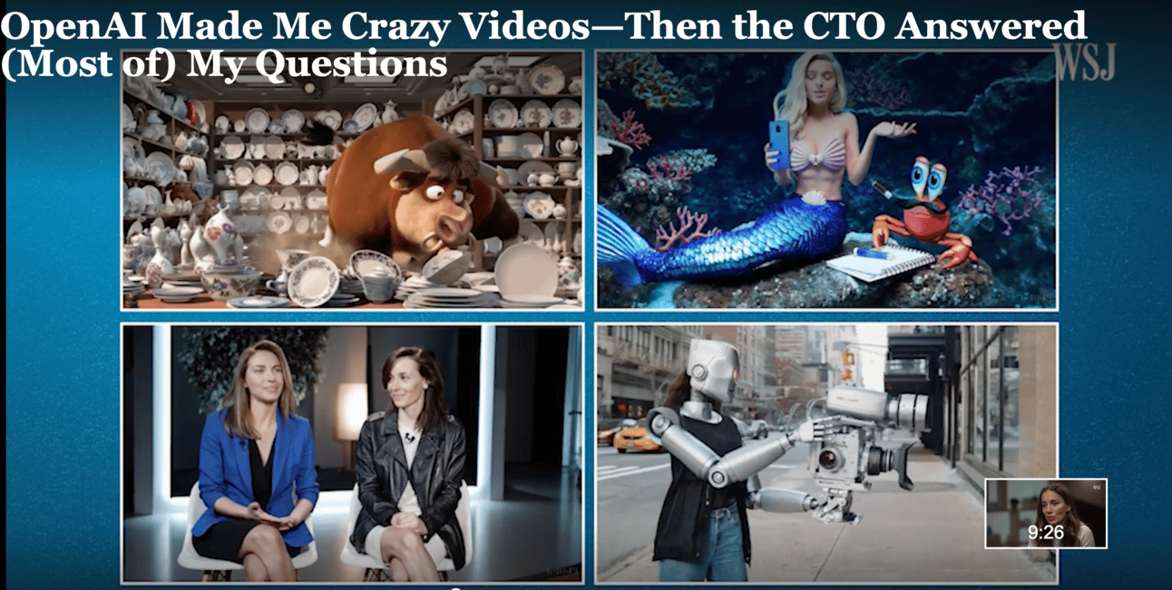 OpenAI CTO Mira Murati gives the most detailed update on Sora in an interview with Joanna Stern. Joanna gave several prompts for them to generate. This was the response to “Female video producer in New York City holding a high-end video camera. Suddenly a robot yanks the camera out of her hand.”