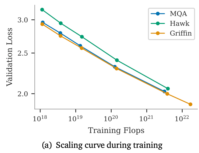 Hawk and Griffin exhibit power-law scaling between held-out loss and training FLOPs, similar to Transformers, with Griffin achieving lower loss at all model scales.
