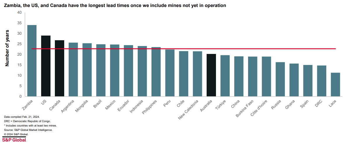 It takes roughly 30 years to get a mine from exploration to production in the US. The US has the second longest time in the world. What about the shortest? Best case: In Laos, where presumably the Chinese pay off every one and rush in with the bare minimum of permitting: 10 years.