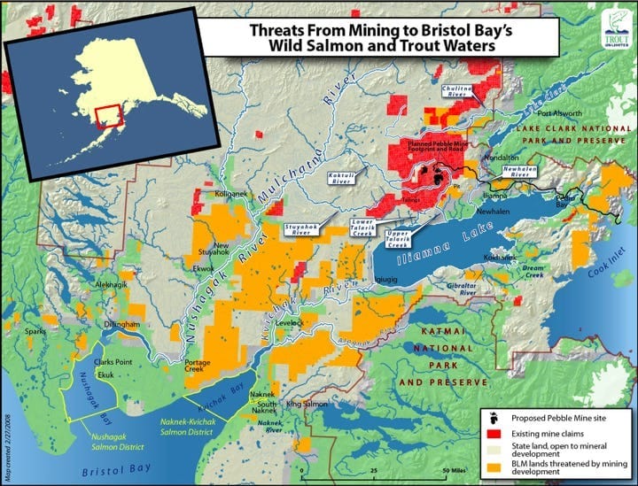 Developed economies have highly motivated, agentic environmentalists, fisherman, hunters, tourists, who co-ordinate to stop progress. Above is map for the proposed Pebble Mine in Alaska, a copper-molybdenum mine which would have produced $350 billion of resources but also threatened salmon fisheries in the area. It was discovered in 1987.