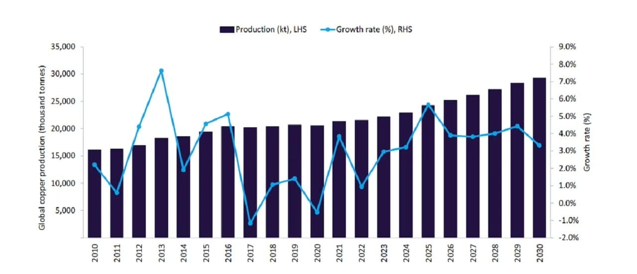 Given the timelines for new mines, you can pretty much predict primary copper supply to 2030, roughly 20% growth to 30,000 kilotonnes. No exponentials here.