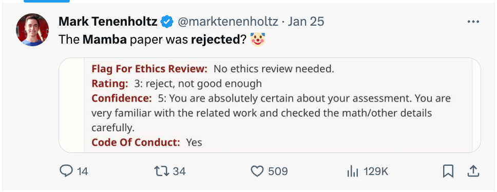 Meanwhile, the MAMBA (potentially the next big architecture after the current one) authors get rejected from ICLR 2024: